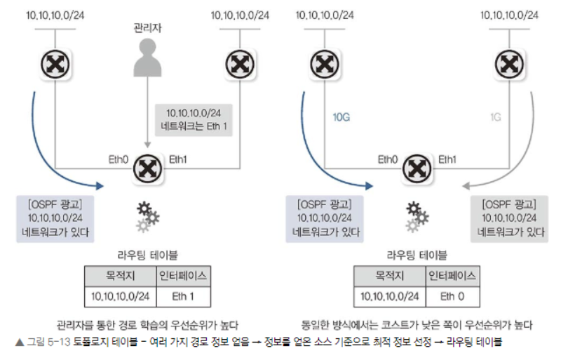 일반적인 경로 정보를 모아놓은 토폴로지 테이블에서 좋은 경로 정보의 우선순위는 경로 정보를 받은 방법과 거리를 기준으로 정함